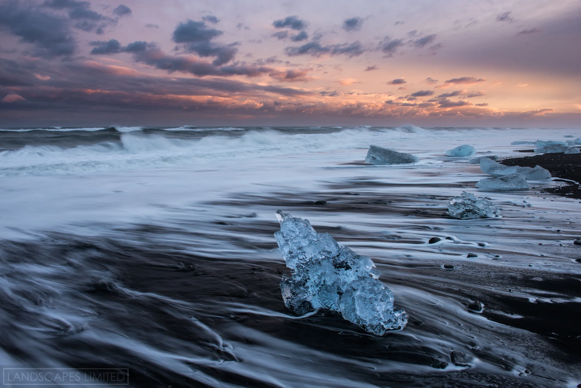 Ice pieces rest on Iceland's Jokulsarlon beach at sunset. MAR 2014